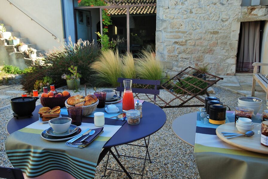 Les petits déjeuners sont servis dans la cour intérieure ou dans le grand salon du mas ; ils sont réalisés à base de produits bio ou/et locaux avec confitures, yaourts, pâtisseries maison et « Gluten Free ».