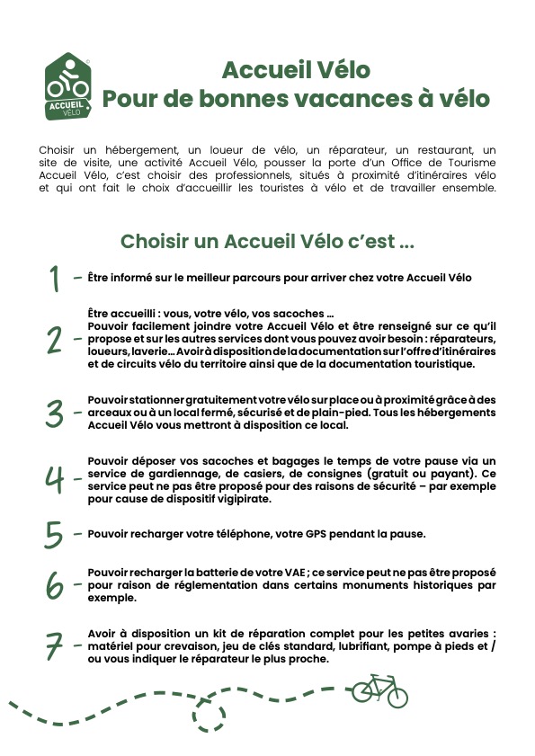 Nos adhérents sont liés par un référentiel "Accueil Vélo", ils sont :
